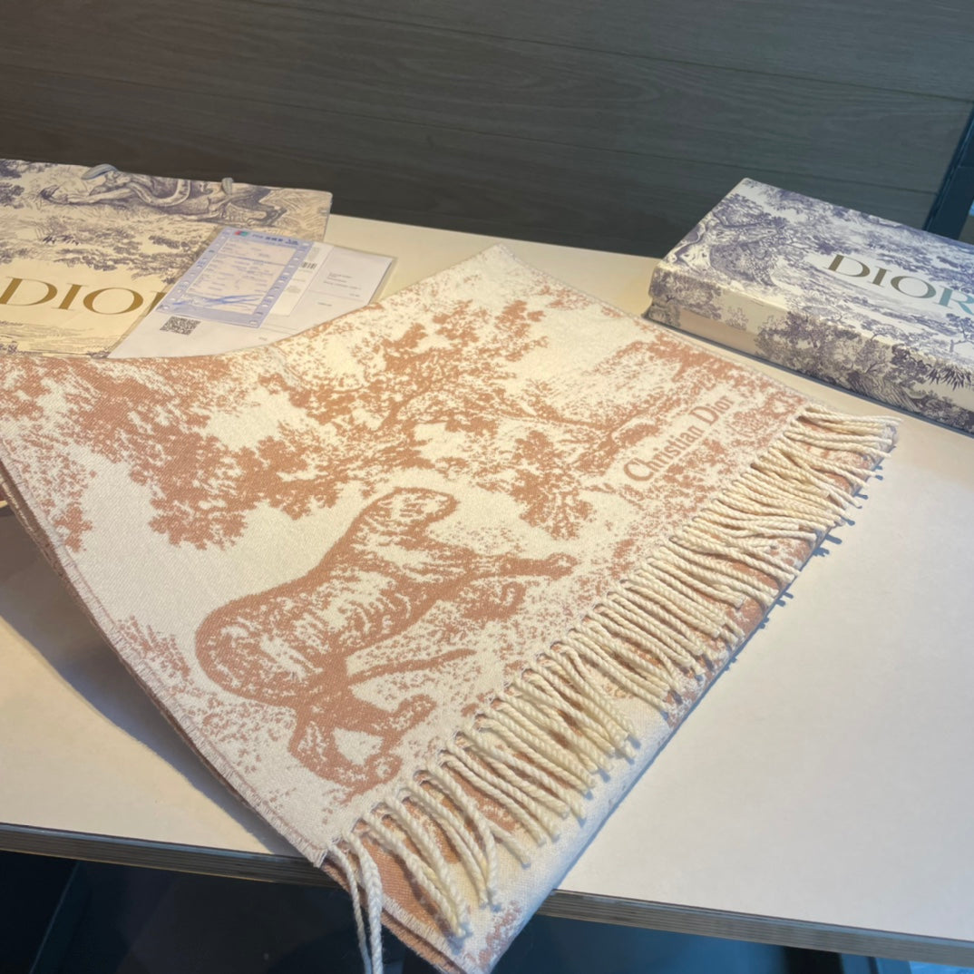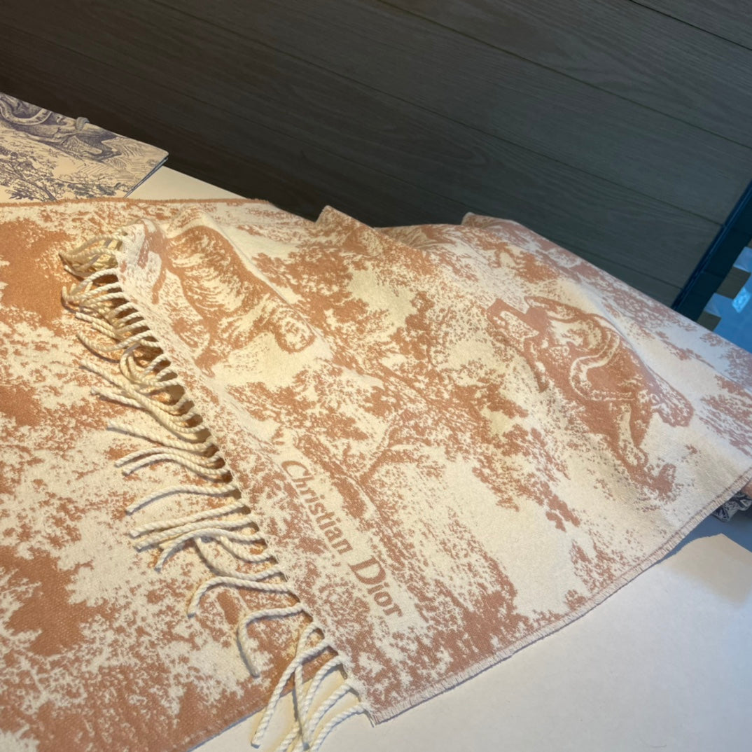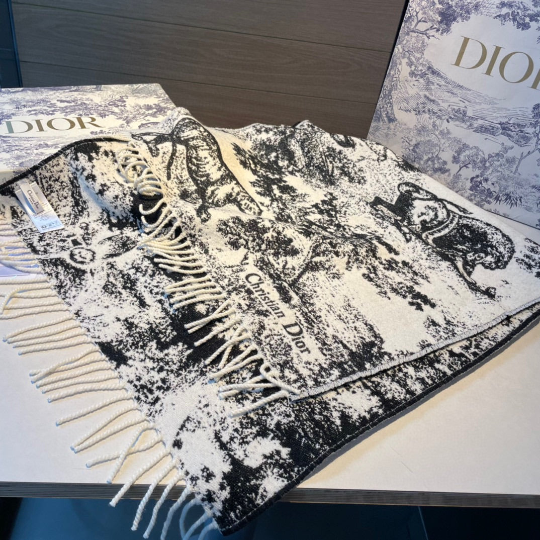 - The scarf offers a new take on the hallmark House motif. Crafted in a blend of cashmere and wool, the style features fringed edging and the signature. Long and enveloping, the scarf can be worn around the neck or draped over the shoulders.