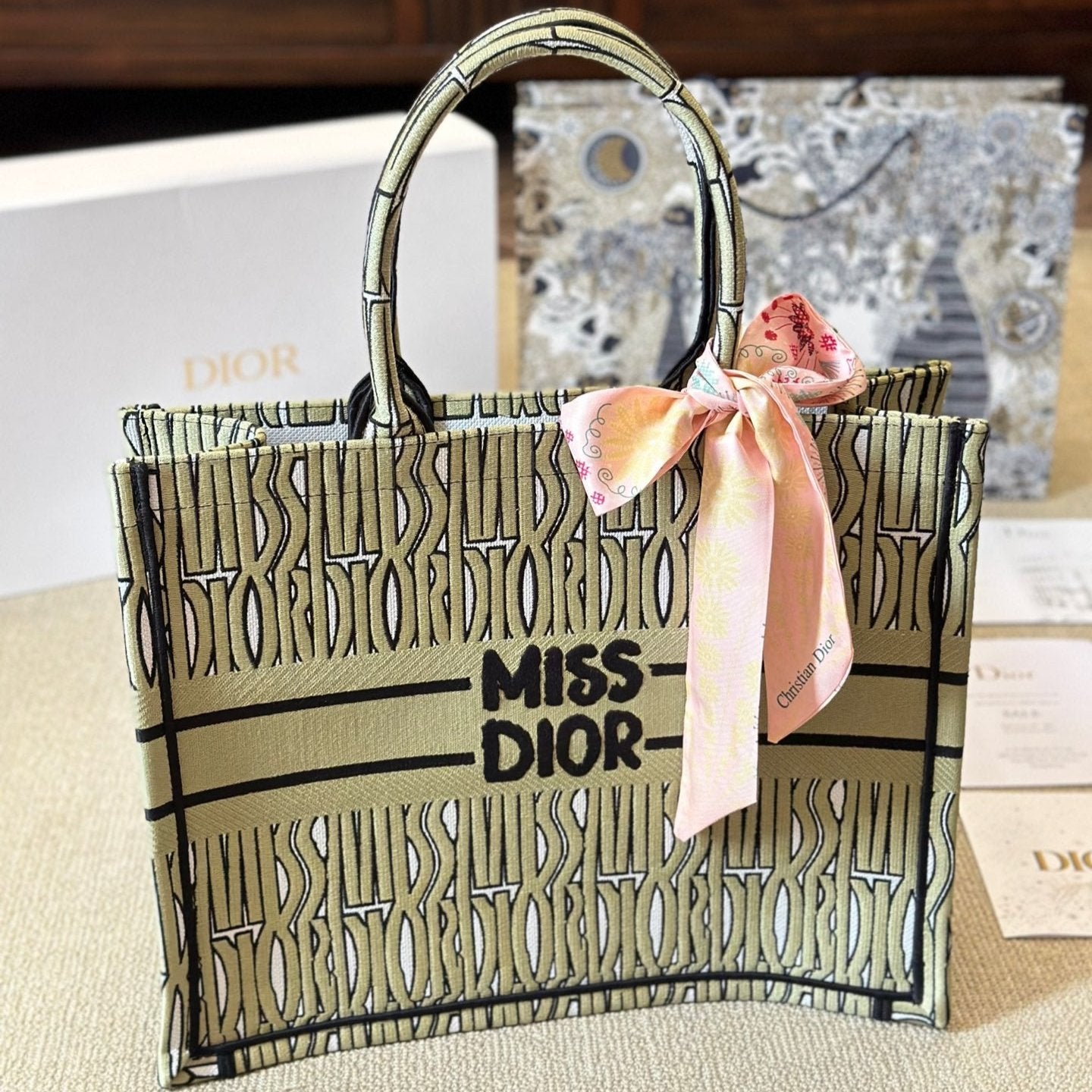 Designed to hold all the daily essentials, the pale style is fully embroidered with the collection's hallmark white Allover motif, inspired by the Marc Bohan for archives in a modern take on the 1960s. Adorned with the Graffiti signature on the front, the medium tote exemplifies the House's savoir-faire and may be carried by hand or worn over the shoulder.
